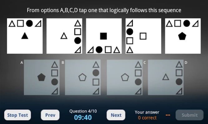 Abstract Reasoning Test - mobile application is designed to help you prepare for these tests. You can switch off the timer easing the pressure to determine the right answer. To answer the question you just need to tap the answer and then tap on the submit button. You can also choose study mode which provides special features to help you better practise find the right answers. This version includes a package of 180 questions categorised in three difficulty levels. Answer images are shuffled every time you start a test therefore providing for 720 possible questions. This is one of the advantages of using this application as compared to paper tests where you are most likely to remember the solution from the last time you saw the question. This application does not require internet access. Once installed on your device, you can practise anywhere you like.