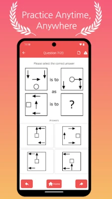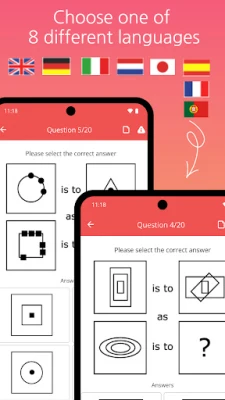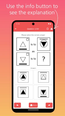 This abstract reasoning app will help you better understand how aptitudes are measured. Many careers require a person of high logical ability and lateral intelligence making abstract reasoning tests fairly popular with employers. This app consists of total 40 multiple-choice questions. On each test you will get 20 random questions. You will be given 4 choices from which to select and complete the missing element. You can always use the bulb button (upper-right) to see the logic in case the question is too hard for you.