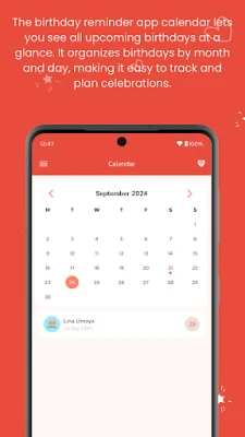 Easy Calendar View: Quickly glance at upcoming birthdays with our intuitive calendar view. it's never been simpler to plan ahead and celebrate with your friends and family.