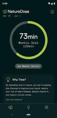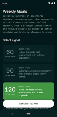 - Set customized weekly NatureDose targets (for example 120 minutes a week)