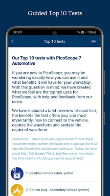 Key features: • Discover how to get started with PicoScope • View our training videos for new users • Learn how to understand waveforms • Take a simple quiz to find the best kit for you • See the content and the tests you can perform with each kit • Watch animations of our Top 10 Guided tests • Read our popular case studies